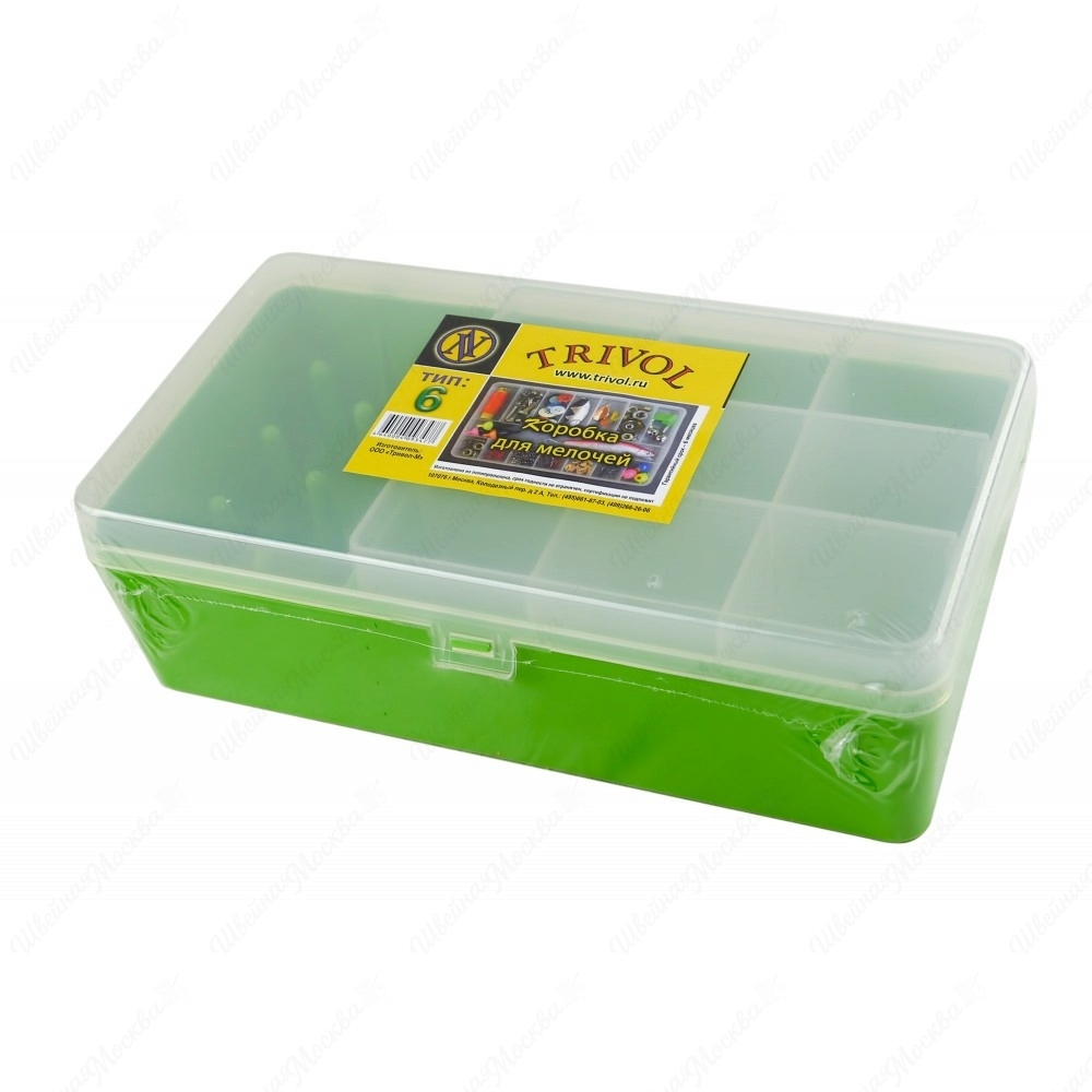 Шкатулка для хранения швейных мелочей. Количество ячеек в нижней части коробки - 3, во вкладыше две съемные перегородки, всего - 9 ячеек.