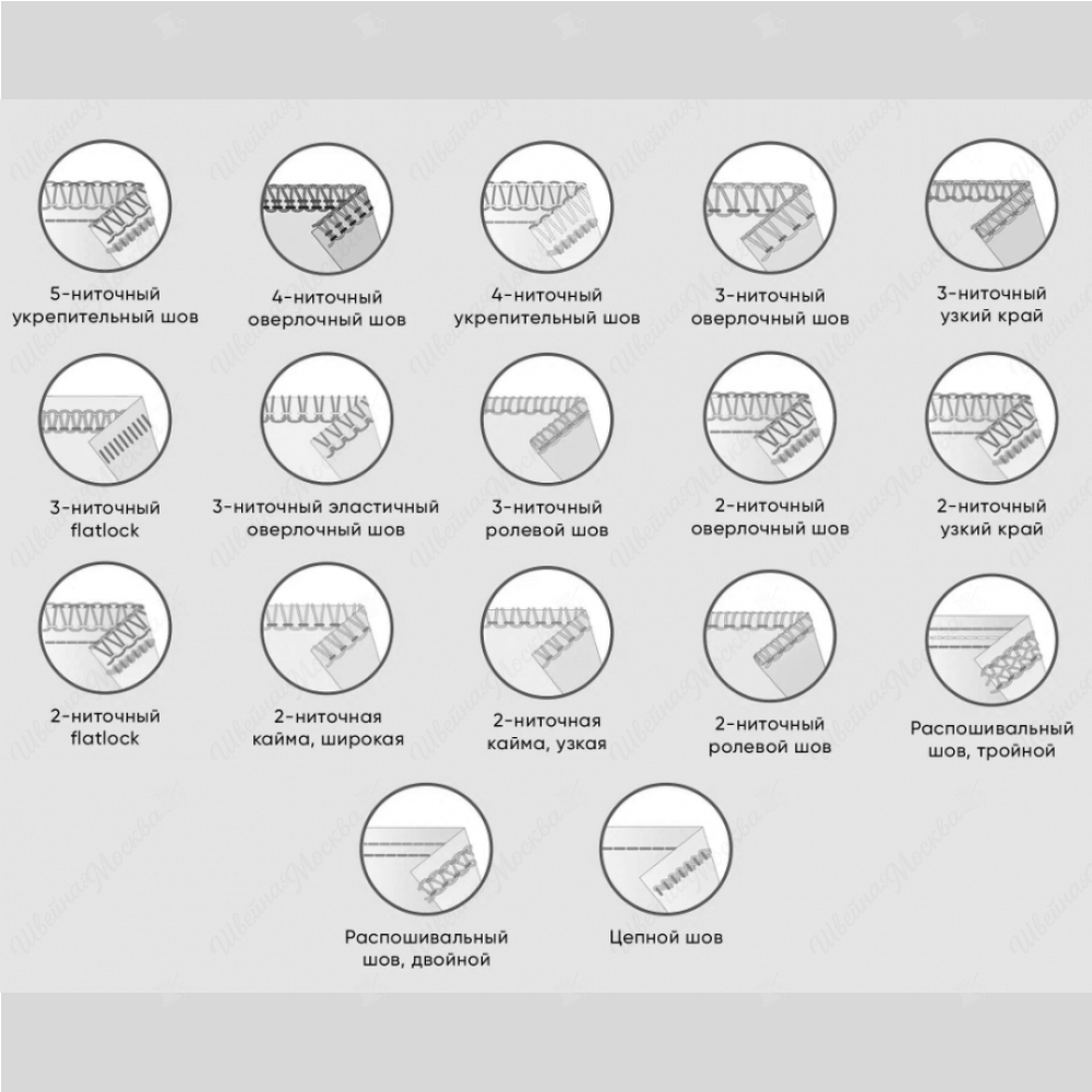 распошивочные швы (3-игольный, 2-игольный широкий, 2-игольный узкий).