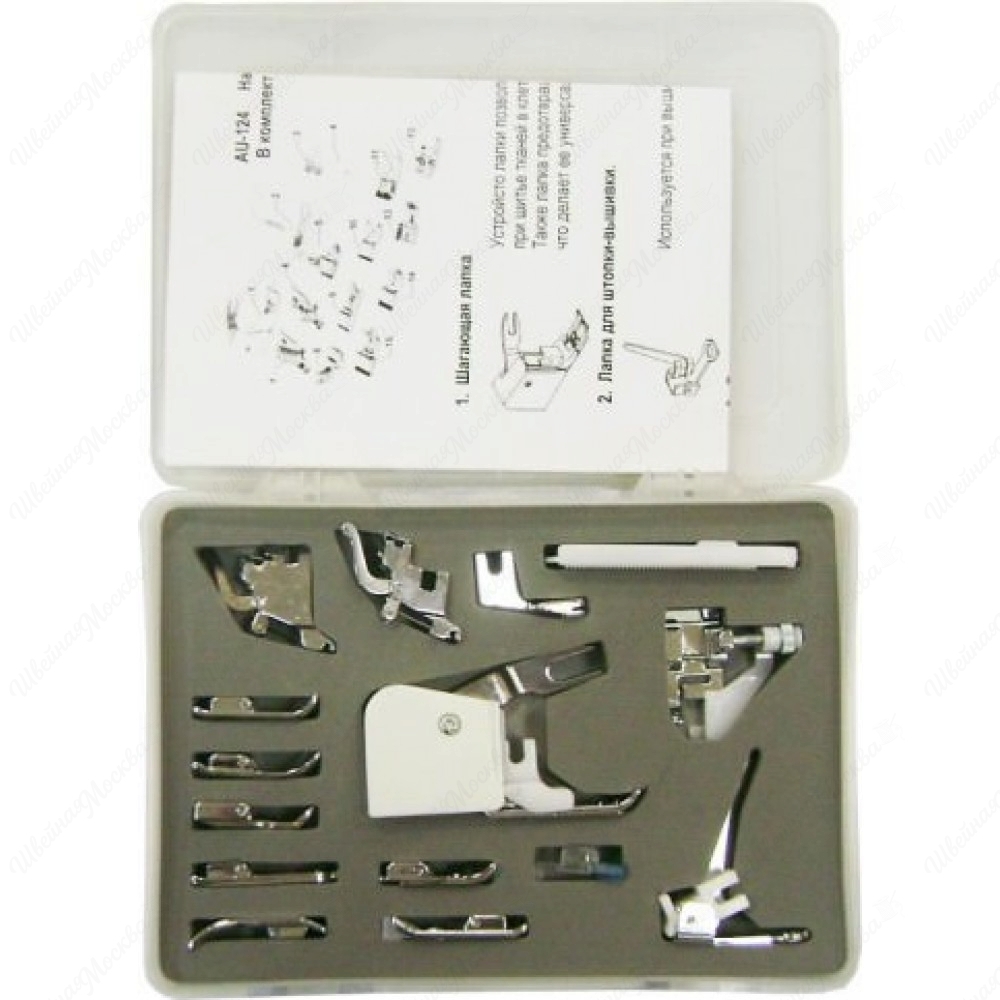 Набор лапок для швейной машины AU 124 – незаменимое решение для любой рукодельницы состоит из 15 элементов. В его комплектации есть все необходимое для успешного выполнения всех необходимых операций. В наличии – штопальные и вышивальные транспортеры, шагающие и образующие потайные строчки варианты, высокий и низкий адаптеры. Также с помощью элементов, входящих в набор, вы сможете обеспечить себе автоматизированное пришивание пуговиц, вшивание молний, крепления элементов декоративной отделки – шнуров, кистей, кантов. Набор лапок AU 124 из 15 штук в блистере ориентирован на использование в сочетании с большинством современных швейных машин популярных моделей и марок.