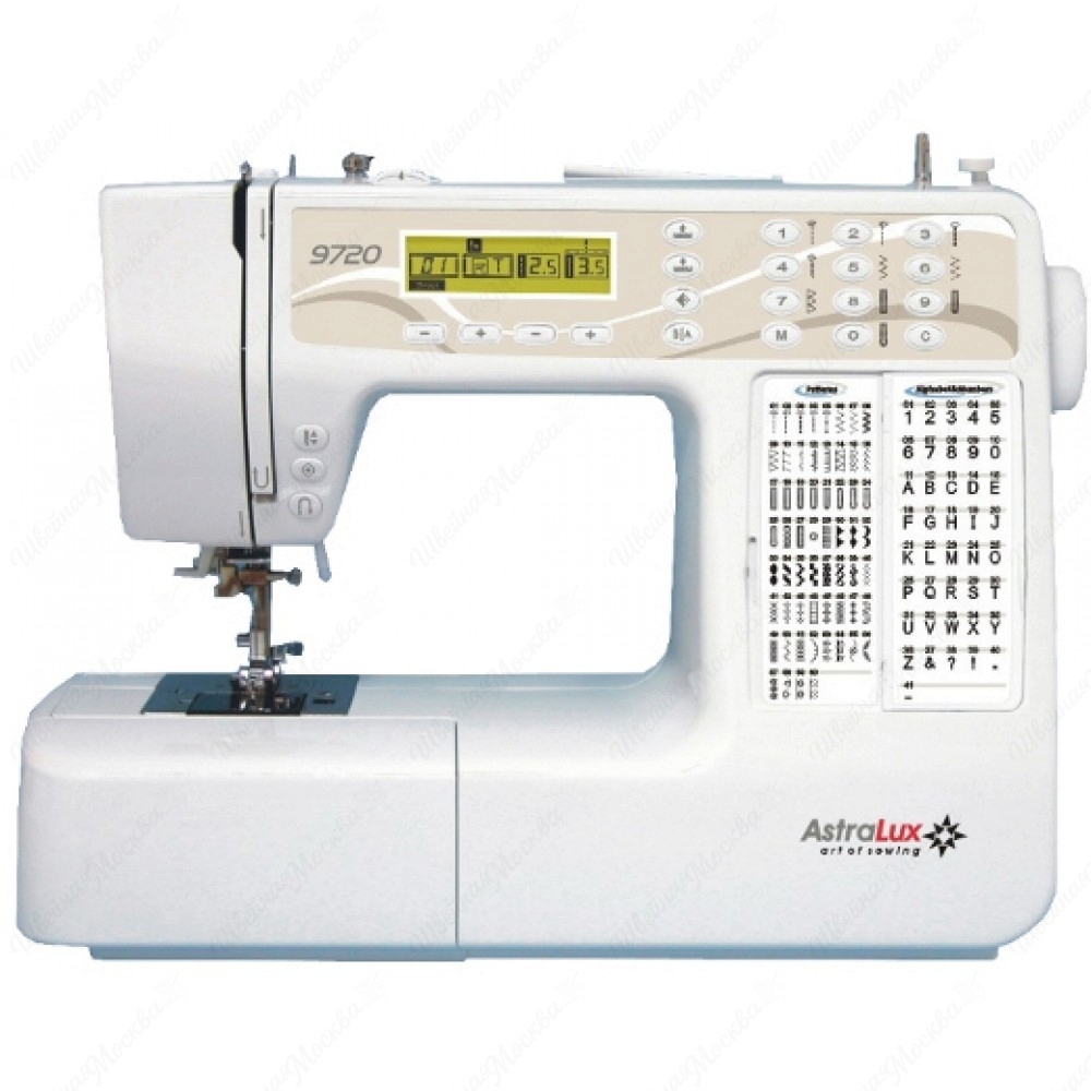 AstraLux 9720 - электронная швейная машина, плавная работа без вибрации , шитье в нескольких направлениях, автоматическое определение размера петель, освещение рабочей зоны, 101 швейных операций, легко справляется с толстыми тканями.