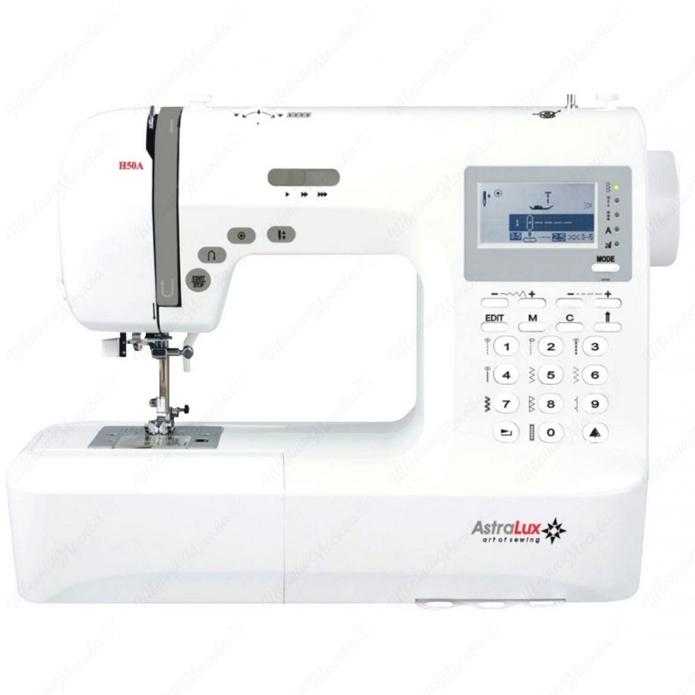 Astralux H50A – это современная компьютеризированная швейная машина, широкие возможности которой оценят не только профессиональные швеи, но и рукодельницы, увлекающиеся созданием аппликаций, пэчворком и квилтингом. Несмотря на многофункциональность, устройство имеет интуитивно понятный интерфейс. Astralux H50A оборудована жидкокристаллическим дисплеем, отображающим всю необходимую информацию о процессе шитья, и ротационным челноком горизонтально типа, обеспечивающим плавный и тихий ход. Функционал аппарата представлен в виде 404 операций, отвечающих за создание разнообразных строк, помимо этого, в его память заложено 2 монограммных шрифта. Доступно выметывание 9-ти типов петель, выполняемых в автоматическом режиме. Дополнительный комфорт при работе обеспечивают швейный советник, светодиодная подсветка, нитевдеватель, функция свободного рукава и кнопка реверса.