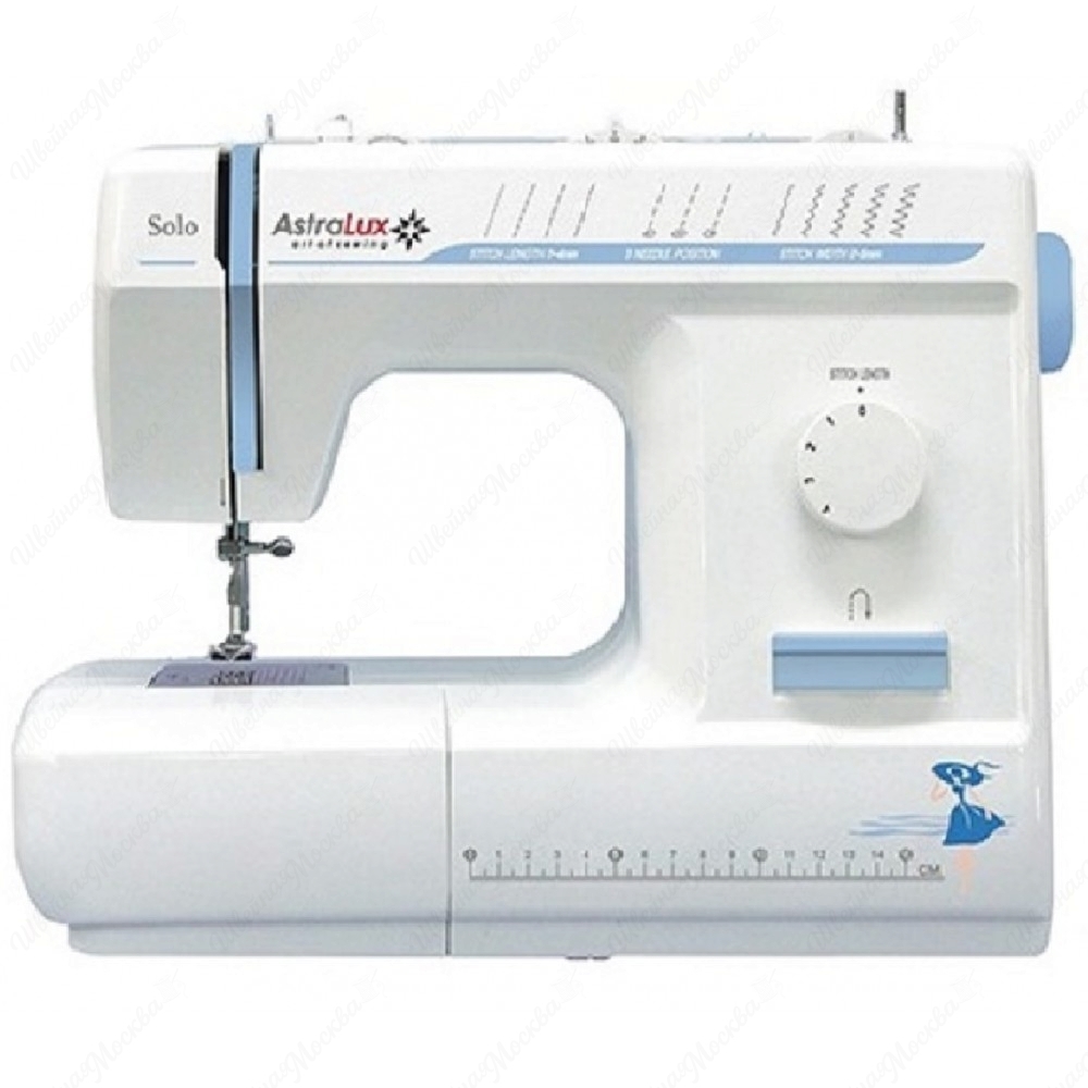 Главной особенностью AstraLux Solo является ротационный челнок вертикального типа, который обеспечивает бесшумную и высококачественную работу. Функционал устройства представлен в виде 12-ти операций, ответственных за создание разнообразных строк и выметывание бельевой петли в полуавтоматическом режиме. Управление всеми опциями осуществляется через дисковый переключатель, над которым расположена таблица, облегчающая выбор нужной строчки. За дополнительный комфорт при шитье отвечают регулятор давления лапки, встроенная подсветка, кнопка реверса, съемная рукавная платформа, ручное устройство обрезки нити и линейка, нанесенная на корпус.