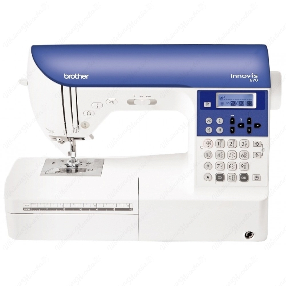 В арсенале данной модели имеется 433 различные операции, в число которых входят рабочие и художественные виды строк, 10 видов петель-автомат и 6 типов шрифтов. Детально настроить каждую из функций можно при помощи встроенного монитора и расположенных ниже кнопок. Максимальная скорость работы Brother INNOV-IS 670 составляет 800 стежков в минуту, а потребляемая мощность 50 Вт. Дополнительный комфорт при шитье обеспечивается за счет яркой светодиодной подсветки, автоматического нитезаправного механизма, системы быстрой намотки шпули, бесшумного горизонтального челнока и регулятора скорости шитья.