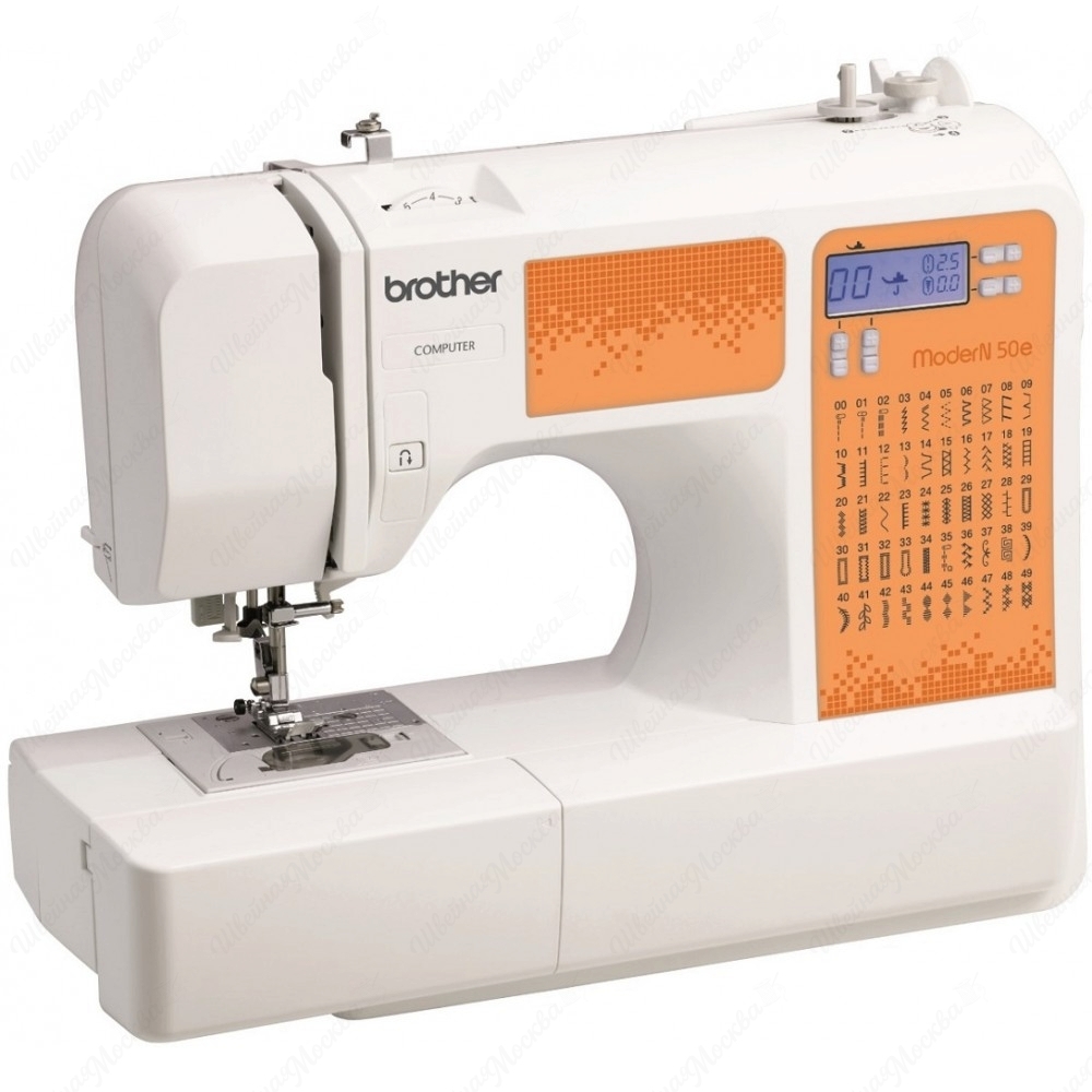 Разобраться в многообразии функций и произвести настройку Brother Modern 50E поможет встроенный монохромный дисплей. Максимальный уровень комфорта во время работы обеспечивает эргономичный корпус и встроенная светодиодная подсветка рабочей зоны, которая существенно снижает нагрузку на глаза. С учетом всех возможностей, данная модель имеет сравнительно небольшие габариты и приемлемую массу в 6 кг. Кроме того, она обладает богатой комплектацией, в которую входят педаль для регулировки скорости пошива, лапки, штопальная пластина, отвертка, шпульки и т.п.