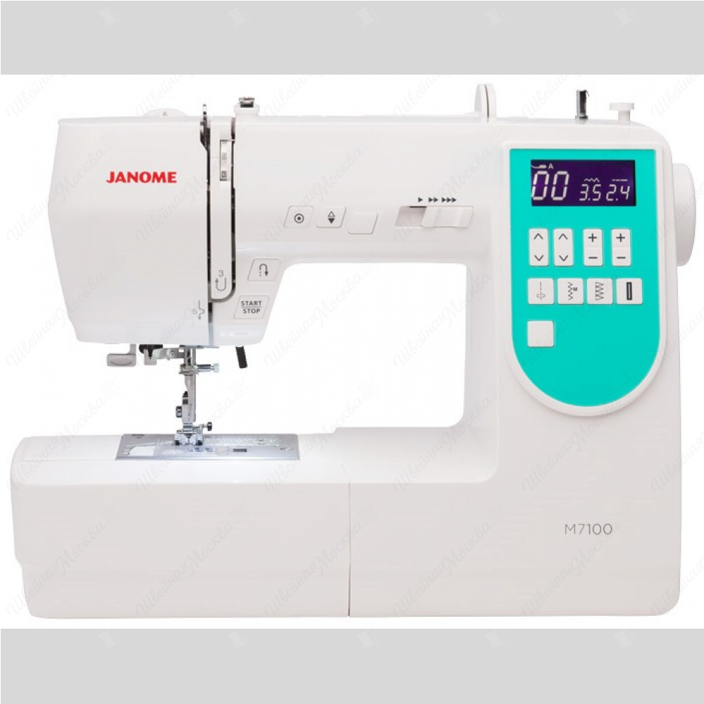 Главной особенностью данной машины является ротационный челнок горизонтального типа, который облегчает процесс заправки шпули и обеспечивает бесшумную работу. Возможности Janome M 7100 представлены в виде 100 операций, большая часть из которых отвечает за создание всевозможных видов строк, а 4 за выметывание петель в автоматическом режиме. Встроенный ЖК-дисплей позволяет осуществлять контроль за ходом работы и отображает множество полезных советов, касающихся параметров стежка, давления лапки на ткань и т.п. Дополнительный комфорт при шитье обеспечивают светодиодная подсветка, съемная рукавная платформа, нитевдеватель, нитеобрезатель и набор лапок, входящий в комплектацию.