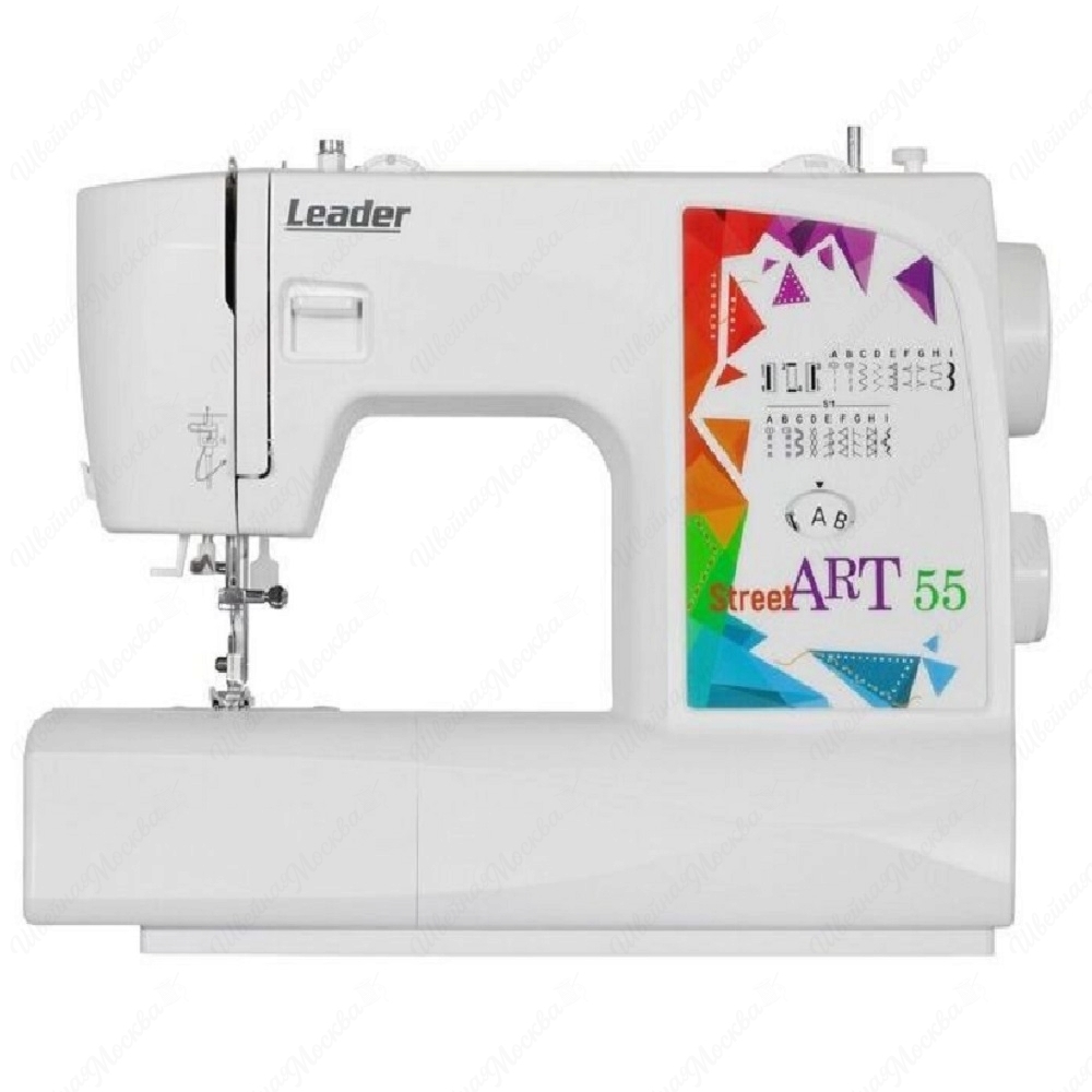 Корпус данной модели выполнен из высокопрочного пластика, который существенно снижает количество вибраций и уровень шума, производимого во время работы. Арсенал возможностей устройства состоит из 22-х операций, которые отвечают за создание различных строк, а также за выметывание петель в полуавтоматическом режиме. Управление всеми имеющимися опциями осуществляется через дисковые переключатели, расположенные на верхней части корпуса. К дополнительным преимуществам Leader STREETART 55 относятся: регулятор давления лапки, функция шитья в нескольких направлениях, автоматический нитевдеватель, яркая подсветка рабочей зоны и съемная рукавная платформа.