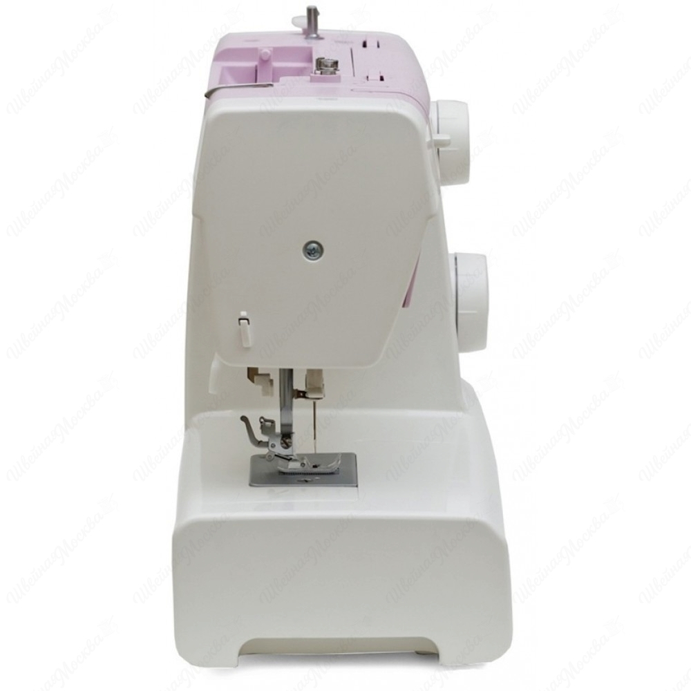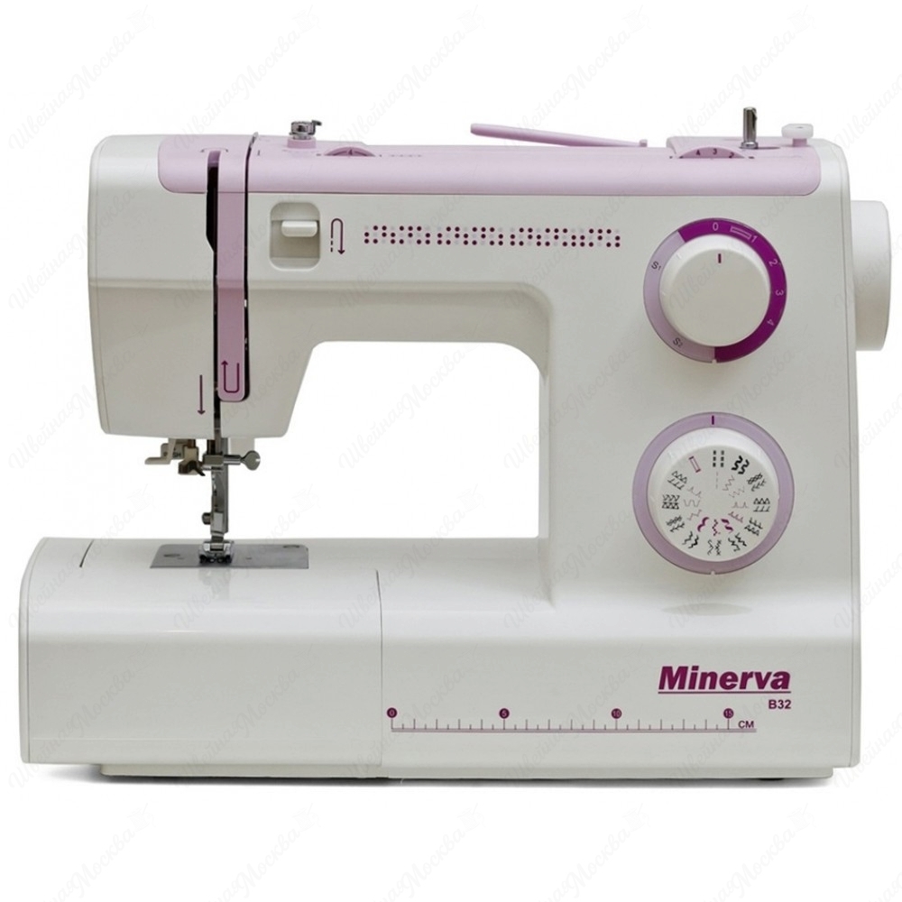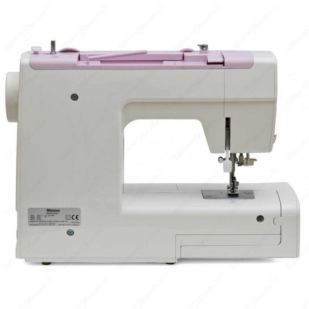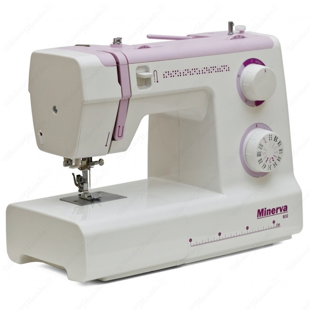 Корпус Minerva B32 сделан из высокопрочного пластика, который обладает шумопоглощающими свойствами и минимизирует общий вес устройства до 8 кг. Механический электропривод позволяет развивать достаточно высокую скорость шитья, доходящую до 860 стежков в минуту при потребляемой мощности в 85 Вт. Немаловажное значение имеет качающийся челнок вертикального типа, который исключает возможность появления пропуска в стежках. К дополнительным преимуществам относится наличие яркой подсветки, нитевдевателя и съемной рукавной консоли.