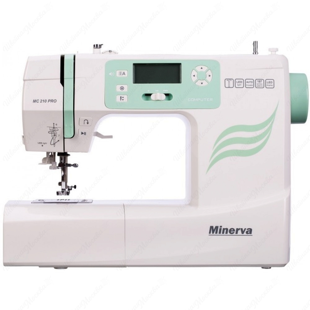 Minerva MC210 PRO — это компьютеризированная швейная машина с 197 функциями. Она оснащена горизонтальным челноком, LED-дисплеем, регулировкой длины и ширины стежка, а также яркой подсветкой рабочей зоны. Модель выполняет 7 видов петель и 97 символов алфавита, включая буквы, цифры и знаки. У неё есть кнопки «Старт/Стоп», позиционирования иглы, точечной закрепки и обратного шитья.
