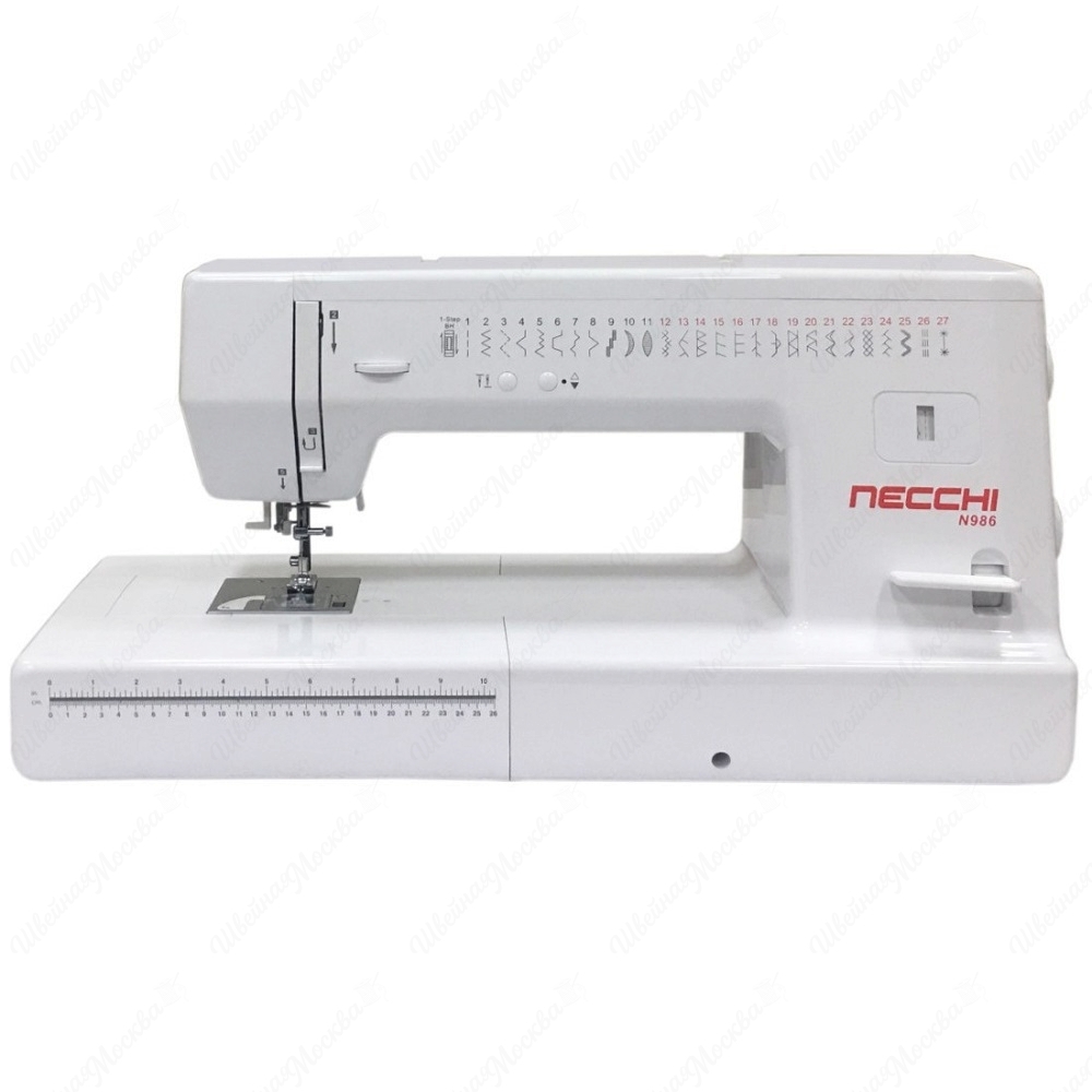 Necchi N986 — это электромеханическая швейная машина с горизонтальным ротационным челноком. Она оборудована автоматической намоткой шпульки, светодиодной подсветкой рабочей зоны и регулятором давления лапки на ткань. В наборе идут универсальная лапка, лапка для молнии, лапка для петли, распарыватель, направляющая для квилтинга, отвёртка и штопальная пластина.