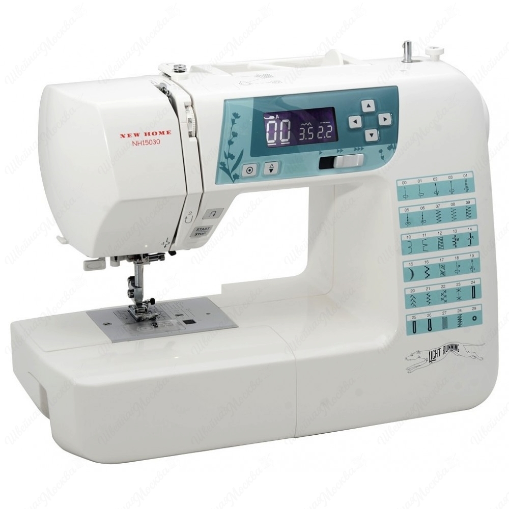 Швейная машина New Home NH15030 – современный аппарат с микропроцессорным управлением. Она имеет не только электропривод, но и электронный блок, а все функции по настойке оборудования выполняет аналоговый компьютер. Нужно только задать соответствующую команду, например, для шитья трикотажа, и высота лапки, натяжение нити и тип стежка будут выбраны автоматически. Возможности швейной машины New Home NH15030 приятно поражают: она умеет делать 30 разных видов строчек и 3 вида петель под пуговицы, а в минуту выполняет более 1000 стежков. Аппарат оснащен ЖК-дисплеем, на котором отображается тип программы, кнопкой шитья без педали, электронным стабилизатором прокола, нитевдевателем и светодиодной лампой. При этом потребляемая мощность оборудования составляет всего 35 Ватт, что говорит о высокой экономичности. Устройство поставляется в мягком защитном чехле.