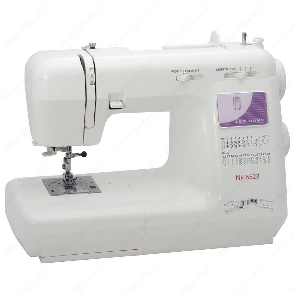 Бытовая электромеханическая швейная машина New Home NH5523 снабжена роторным челноком горизонтального типа, за счет чего работает бесшумно и делает идеально ровные строки. Аппарат может осуществлять 23 различные операции: автоматически выметывать петли под пуговицы, делать стандартные, потайные, эластичные, обметочные, декоративные, зигзагообразные и другие швы, вышивать гладью, соединять края тканей мостовыми стежками и т.п. К числу достоинств швейной машины New Home NH5523 следует отнести наличие удобной линейки на корпусе, встроенной галогеновой лампы и нитевдевателя. Данная модель поставляется в жестком чехле и в комплекте с дополнительными приспособлениями: набором лапок и игл, отвертками и кисточкой для чистки, распарывателем швов и др.