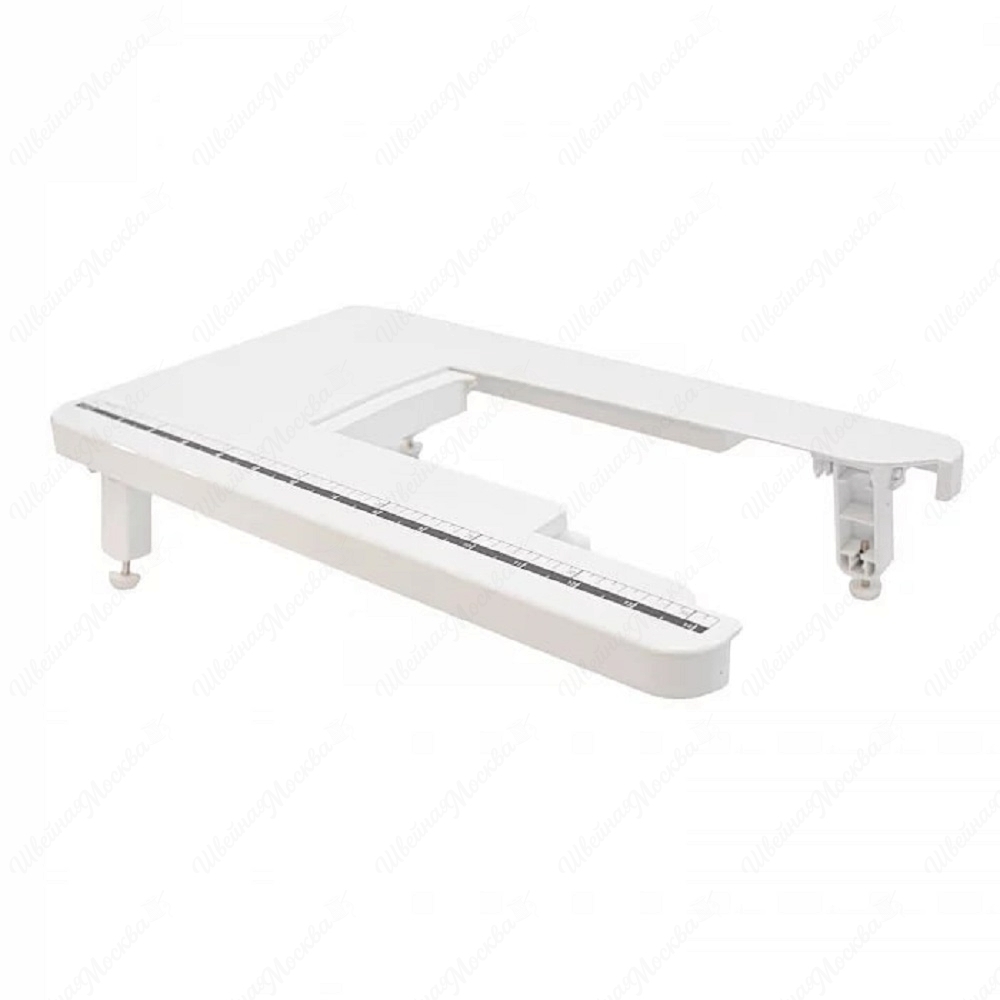 Brother WT7 выполнен из высококачественного пластика белого цвета. На передней части столика имеется сантиметровая разметка, помимо этого, он снабжен устойчивыми ножками, положение которых можно регулировать в соответствии с требованиями. Установить такой аксессуар довольно просто – достаточно снять часть рукавной платформы и придвинуть его вплотную к машинке. Подобный столик необходим тем, кто занимается лоскутным шитьем, выстегиванием, а также работает с объемными изделиями, такими как шторы, занавеси, постельное белье.